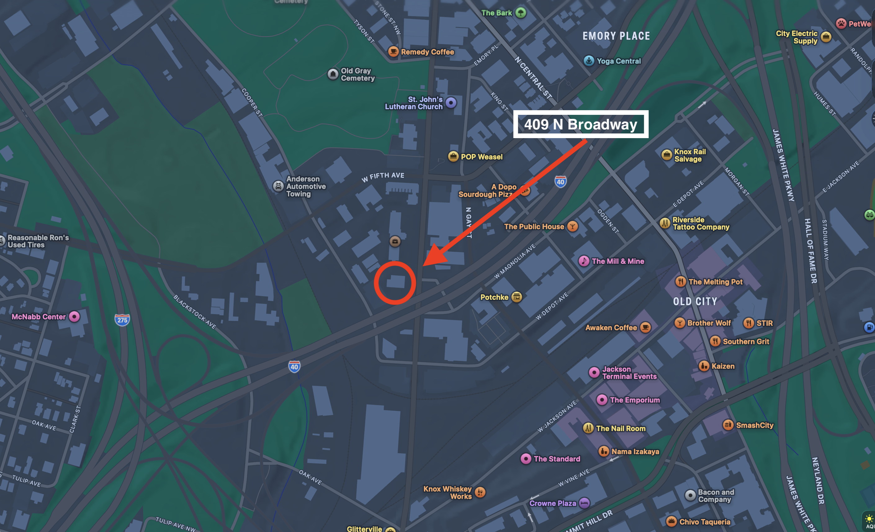 The address is 409 N Broadway, Knoxville, TN 37917. GPS will get you to the entrance of the Salvation Army campus. We are located in the building on the left as you turn into the parking lot, through the open gate. You can park alongside the building or in any of the open spaces in front of the building.