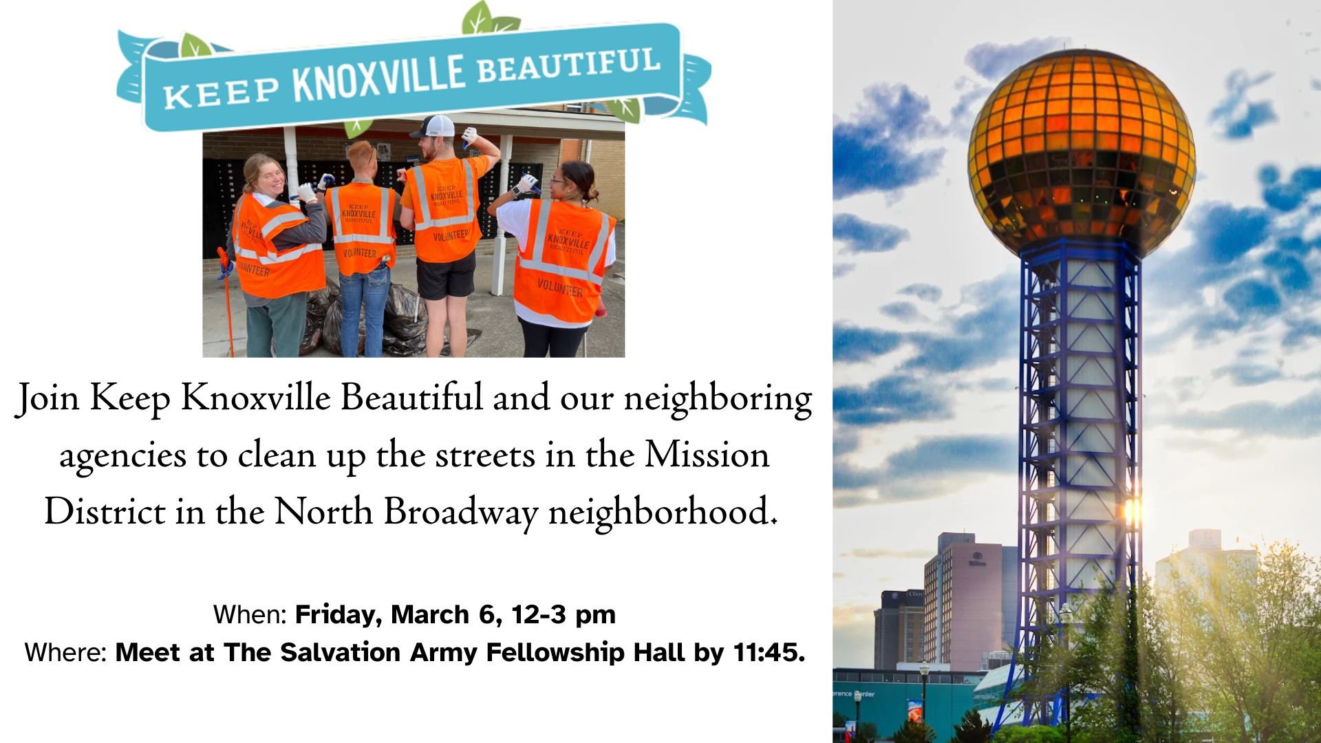 Join Keep Knoxville Beautiful and our neighboring agencies in the North Broadway neighborhood, aka the Mission District, to clean up the streets in our neighborhood. Clean-up starts at noon, we'll meet in the Fellowship Hall at the Salvation Army at 11:45. Come help out even if you can't stay the entire time!